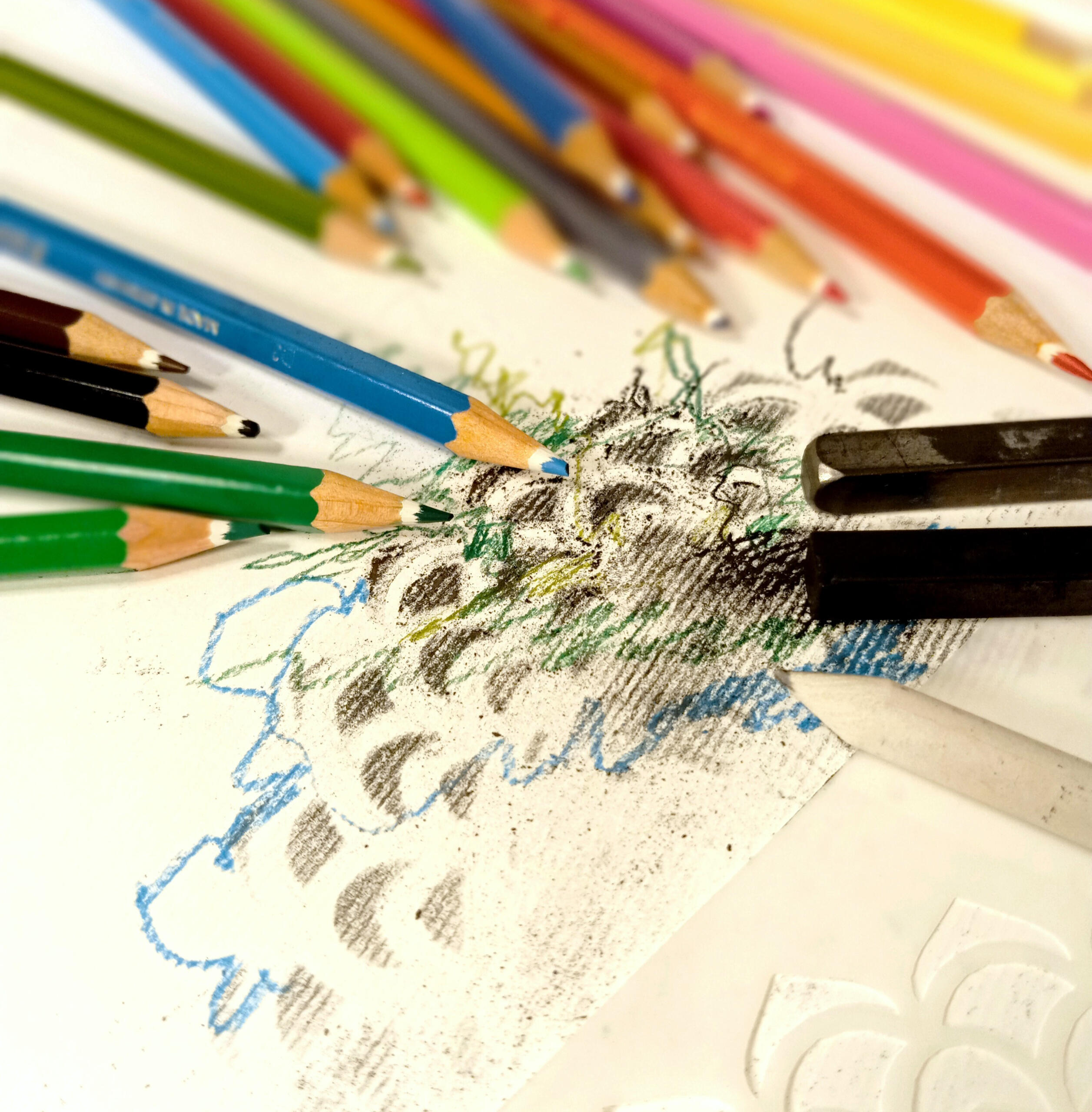 Im Atelier gibt es Bunt- und Filzstifte, Kohle, Grafit-, Öl- und Pastellkreiden, Zeichentusche, Aquarell- Acryl- und Wasserfarben, Gouache, Ton, Materialien zum Collagieren, Stoffe, Garn und Draht, Filzwolle, diverse Papierformate, Inspirations- und Impulskarten und und und...