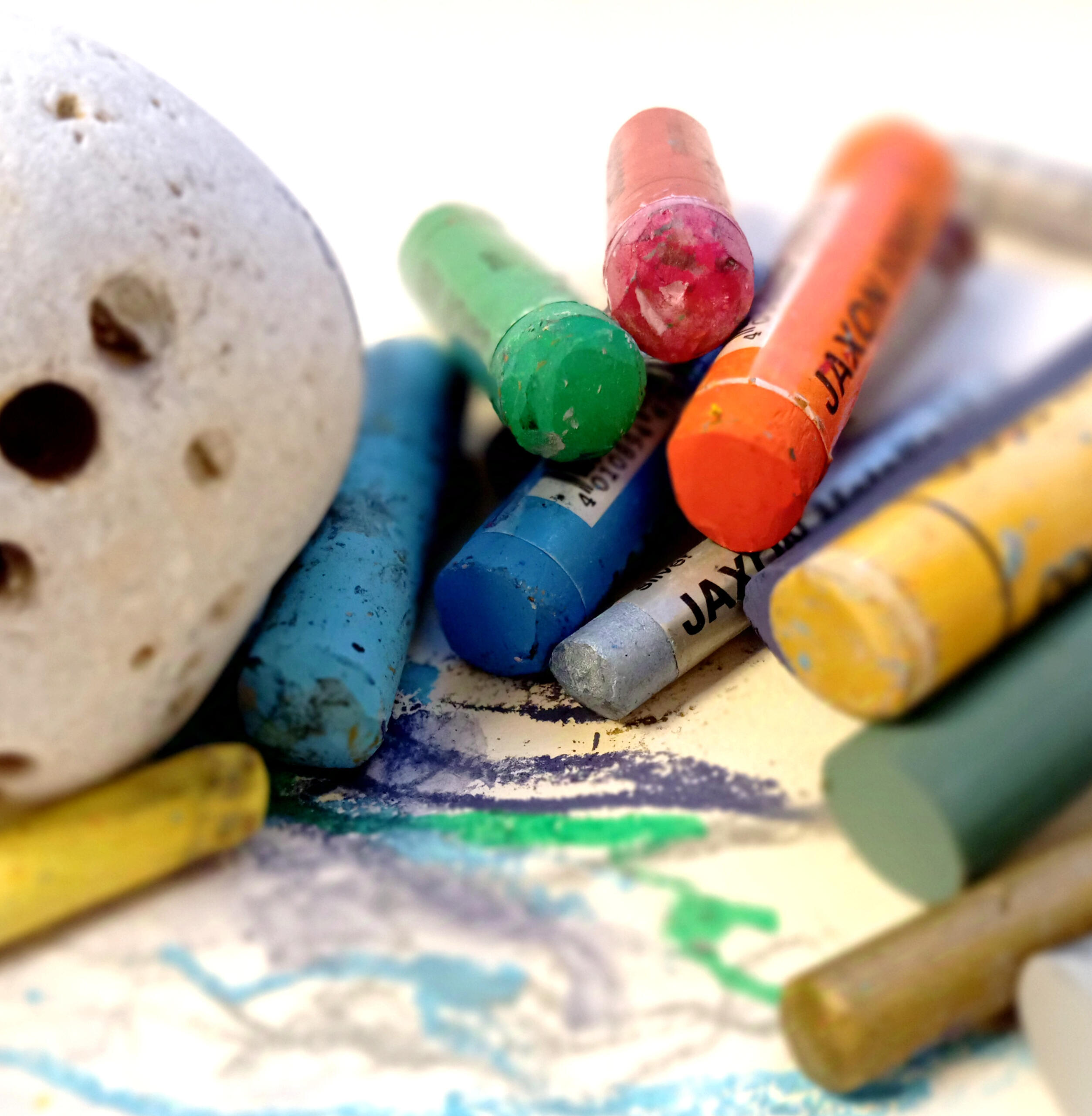 Damit kann man zeichnen, malen, mischen, kneten, drehen, schmieren, klopfen, schneiden, kleben, zerreißen, bauen, kratzen, nähen, verstecken, rieseln, legen und und und...